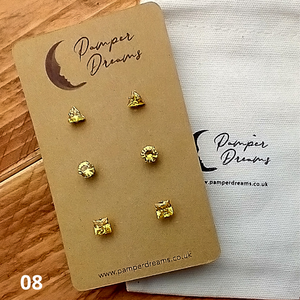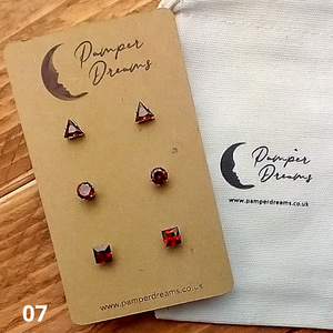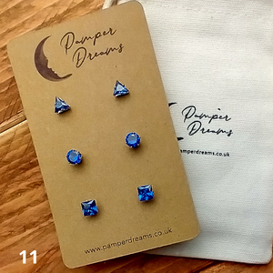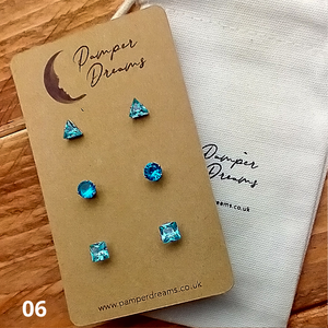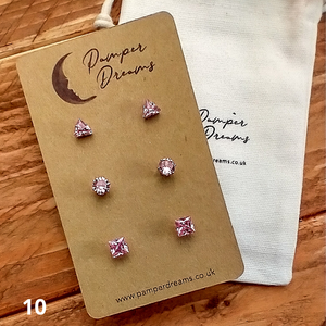 Free Bamboo Gift PouchNickel free geometric stud earrings set 3 pairs each set• CZ Triangle Studs 6mm• CZ Round Studs 6mm• CZ Square Studs 6mm